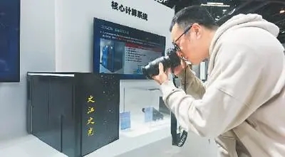 觀眾在2023第二屆全球數(shù)字貿(mào)易博覽會上拍攝“之江之光”超算裝置模型。 龍 巍攝(人民圖片)