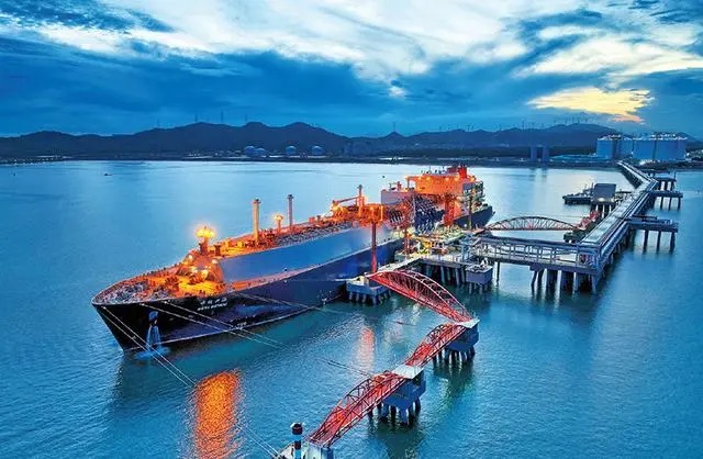 綠色低碳是新型工業化的生態底色。圖為2024年9月8日,滿載7.2萬噸液化天然氣的“中能北海”號靠泊中國石化天然氣分公司華瀛液化天然氣接收站進行接卸,這標志著中國石化在廣東的首個液化天然氣項目正式投運。 人民圖片 胡慶明/攝