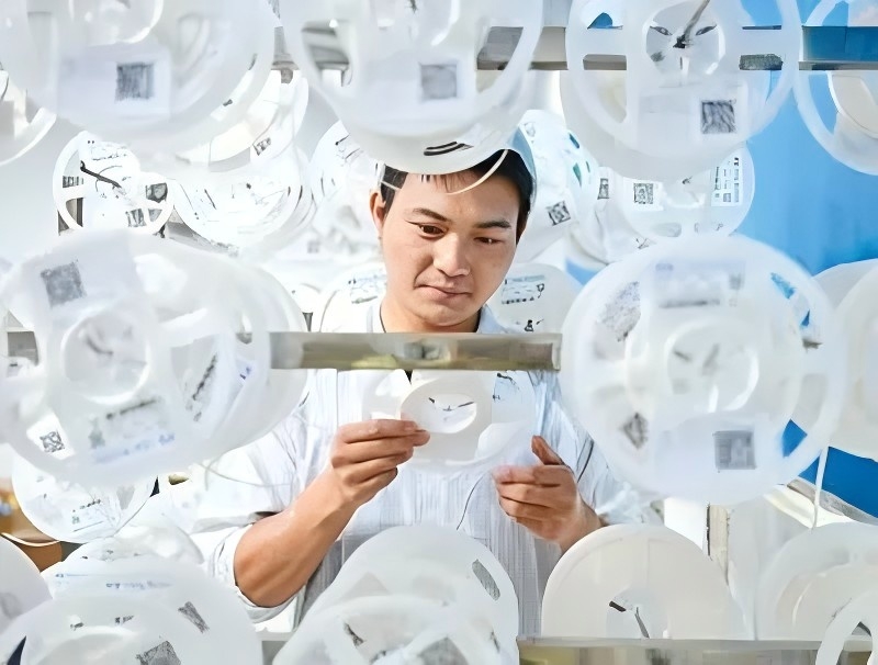 在江西省撫州市的一家5G電子元器件制造企業,一名技術工人在數字化車間生產5G網絡通訊光纖交換機電源元器件。朱海鵬攝(人民視覺)