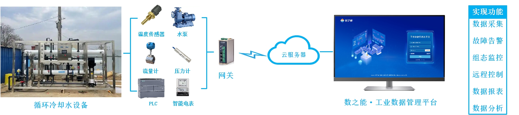 近年來,工業領域加快推動用水方式的資源化轉變,大力推廣節水技術、工藝及裝備,循環冷卻水設備得到廣泛應用。通常,循環冷卻水系統由PLC、冷卻塔、循環水泵、換熱器、管道閥門以及水處理裝置等組成,這些設備的運行狀態與能源利用效率息息相關,越來越成為企業數字化轉型必須監控起來的重要指標。
