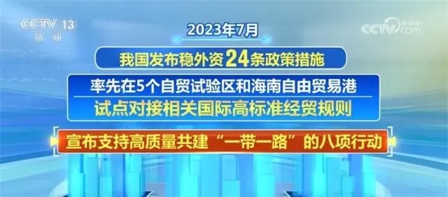 2023年7月,我國發(fā)布穩(wěn)外資24條政策措施,率先在5個(gè)自貿(mào)試驗(yàn)區(qū)和海南自由貿(mào)易港試點(diǎn)對(duì)接相關(guān)國際高標(biāo)準(zhǔn)經(jīng)貿(mào)規(guī)則,宣布支持高質(zhì)量共建“一帶一路”的八項(xiàng)行動(dòng)。